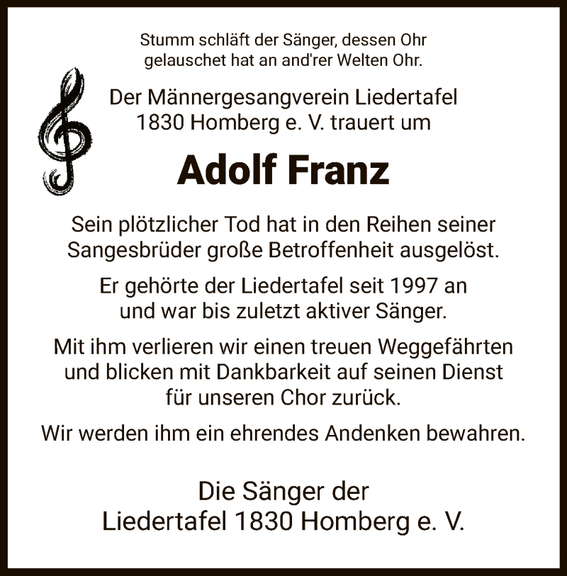Hier finden Sie alle Traueranzeigen aus der Zeitung, die bisher für Adolf Franz erschienen sind. Weitere Traueranzeigen, die in der Zeitung erscheinen, werden hier ebenfalls aufgelistet