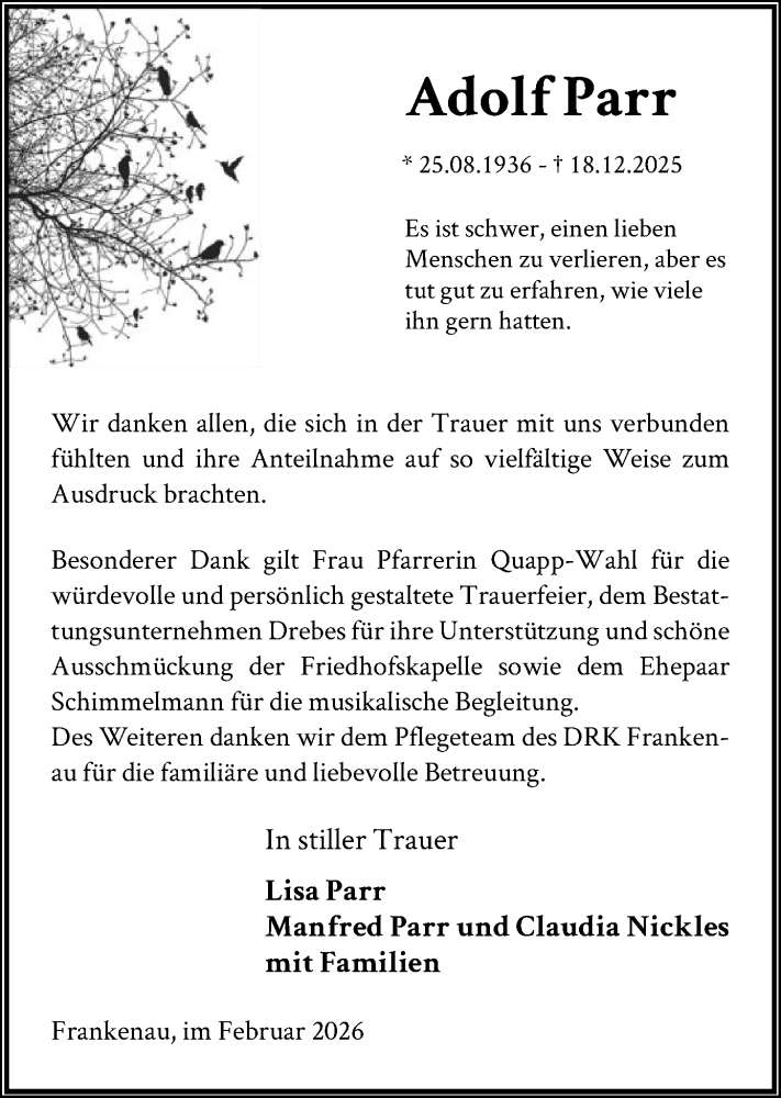 Hier finden Sie alle Traueranzeigen aus der Zeitung, die bisher für Adolf Parr erschienen sind. Weitere Traueranzeigen, die in der Zeitung erscheinen, werden hier ebenfalls aufgelistet