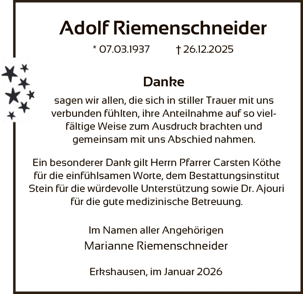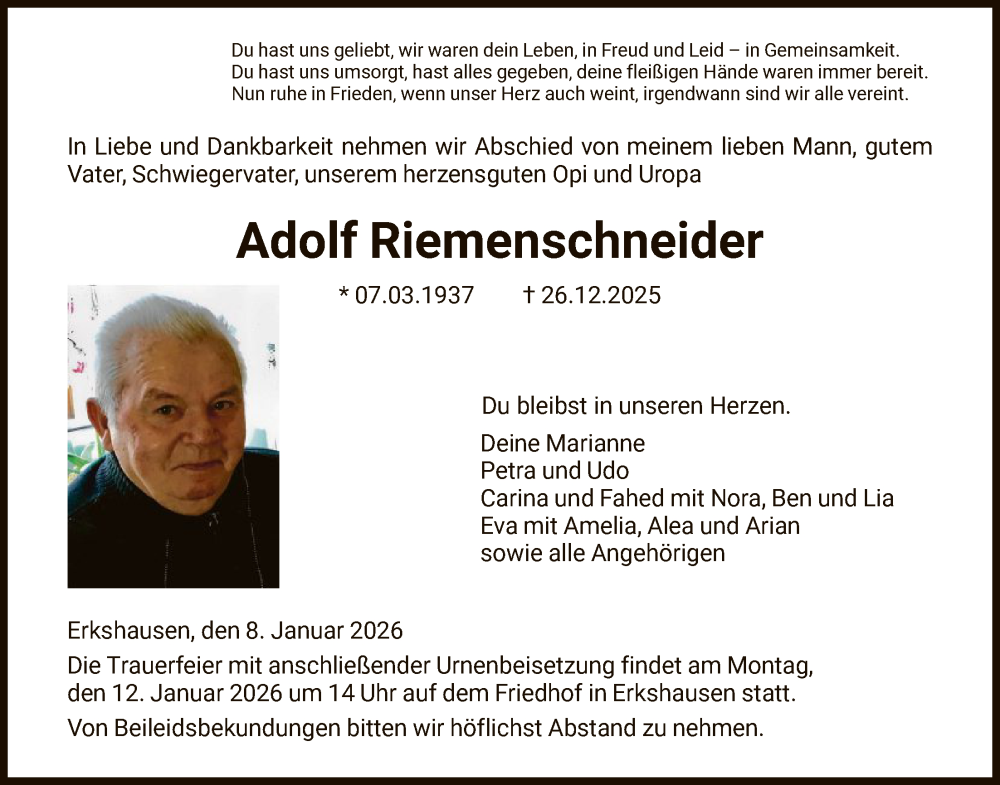Hier finden Sie alle Traueranzeigen aus der Zeitung, die bisher für Adolf Riemenschneider erschienen sind. Weitere Traueranzeigen, die in der Zeitung erscheinen, werden hier ebenfalls aufgelistet