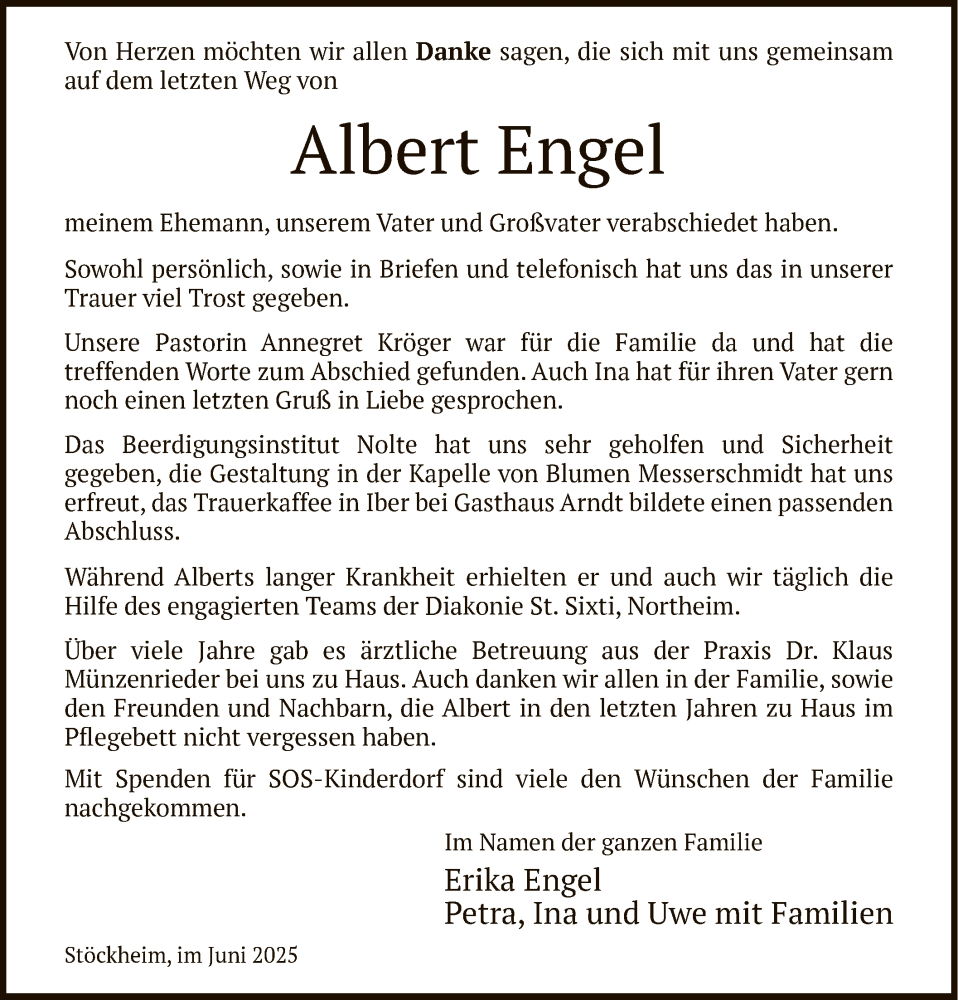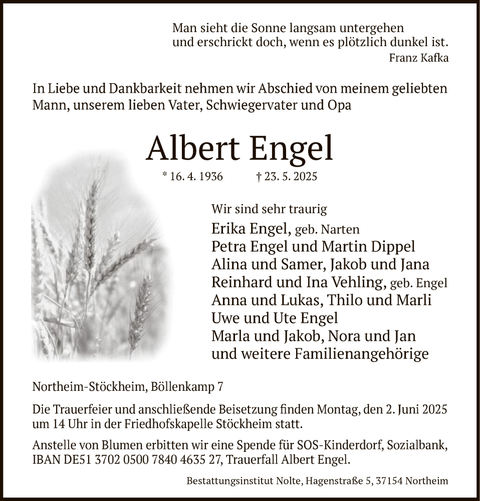 Hier finden Sie alle Traueranzeigen aus der Zeitung, die bisher für Albert Engel erschienen sind. Weitere Traueranzeigen, die in der Zeitung erscheinen, werden hier ebenfalls aufgelistet