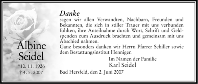Hier finden Sie alle Traueranzeigen aus der Zeitung, die bisher für Albine Seidel erschienen sind. Weitere Traueranzeigen, die in der Zeitung erscheinen, werden hier ebenfalls aufgelistet