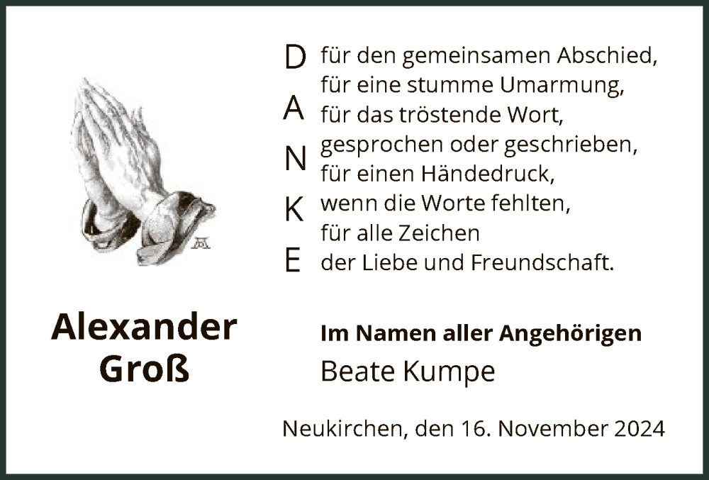 Hier finden Sie alle Traueranzeigen aus der Zeitung, die bisher für Alexander Groß erschienen sind. Weitere Traueranzeigen, die in der Zeitung erscheinen, werden hier ebenfalls aufgelistet