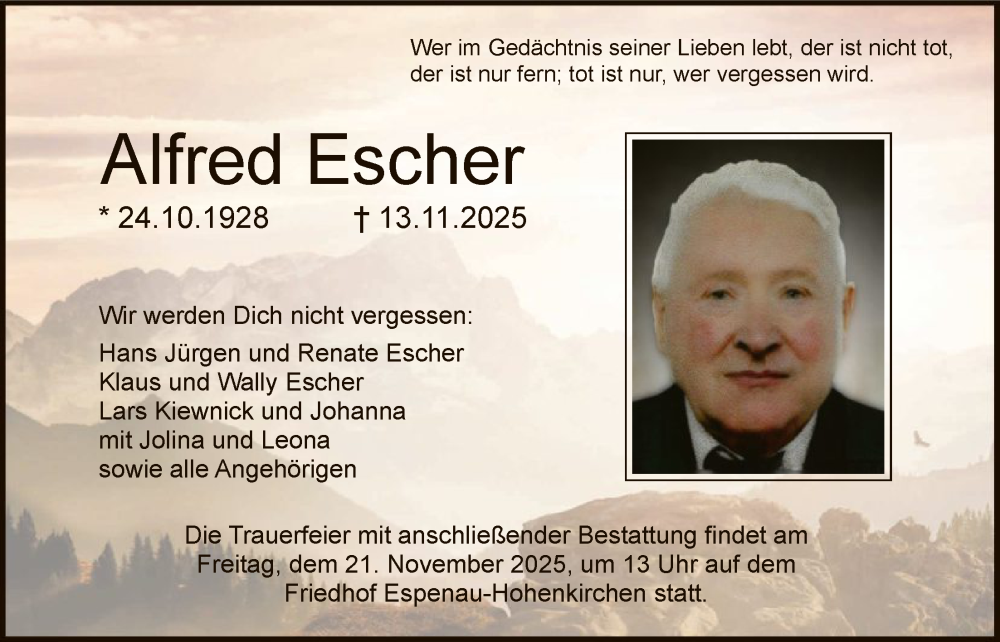 Hier finden Sie alle Traueranzeigen aus der Zeitung, die bisher für Alfred Escher erschienen sind. Weitere Traueranzeigen, die in der Zeitung erscheinen, werden hier ebenfalls aufgelistet