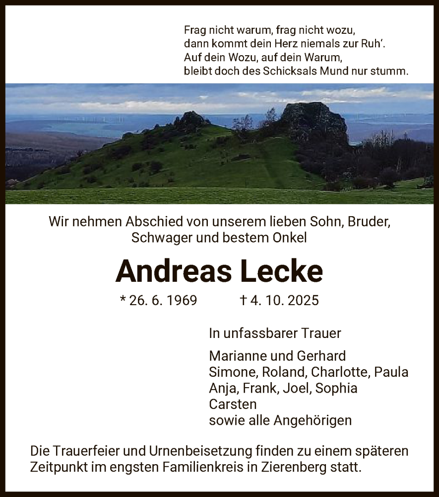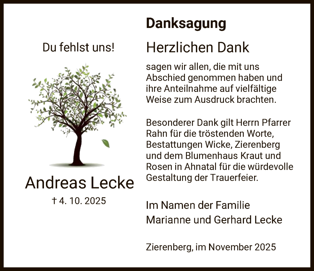 Hier finden Sie alle Traueranzeigen aus der Zeitung, die bisher für Andreas Lecke erschienen sind. Weitere Traueranzeigen, die in der Zeitung erscheinen, werden hier ebenfalls aufgelistet