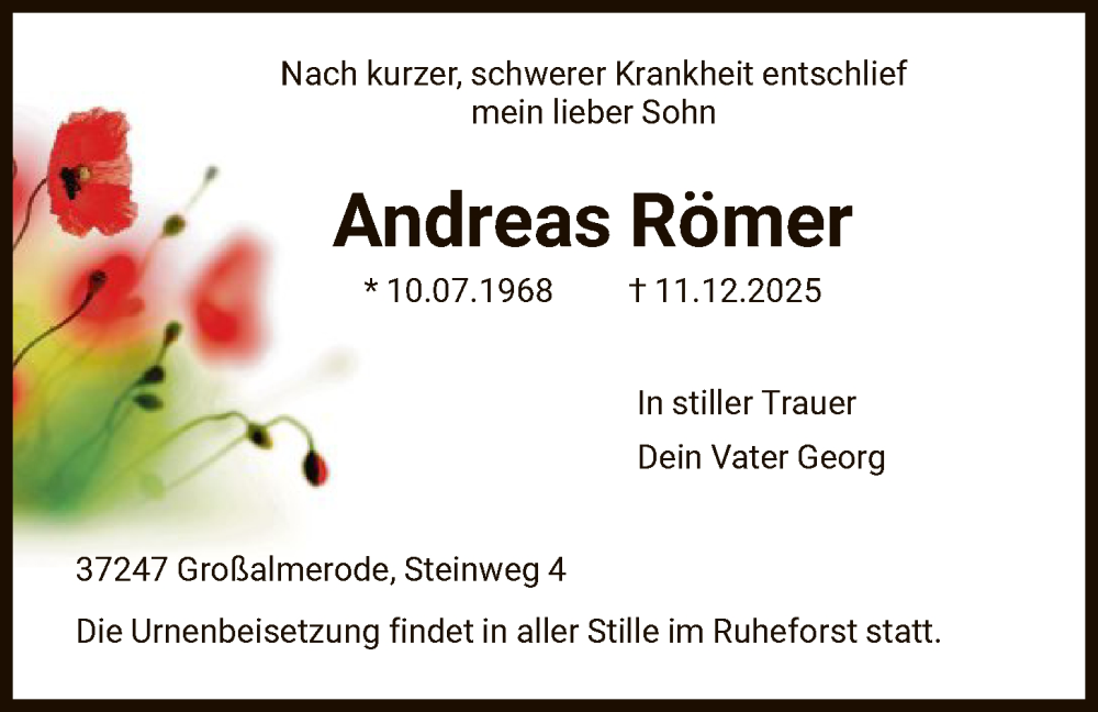 Hier finden Sie alle Traueranzeigen aus der Zeitung, die bisher für Andreas Römer erschienen sind. Weitere Traueranzeigen, die in der Zeitung erscheinen, werden hier ebenfalls aufgelistet