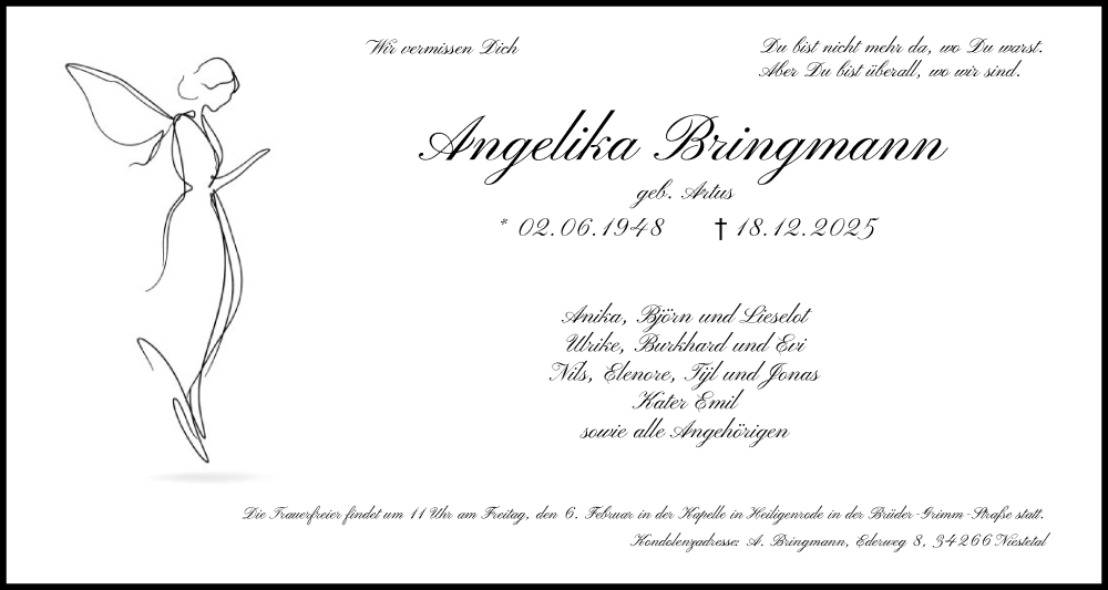Hier finden Sie alle Traueranzeigen aus der Zeitung, die bisher für Angelika Bringmann erschienen sind. Weitere Traueranzeigen, die in der Zeitung erscheinen, werden hier ebenfalls aufgelistet