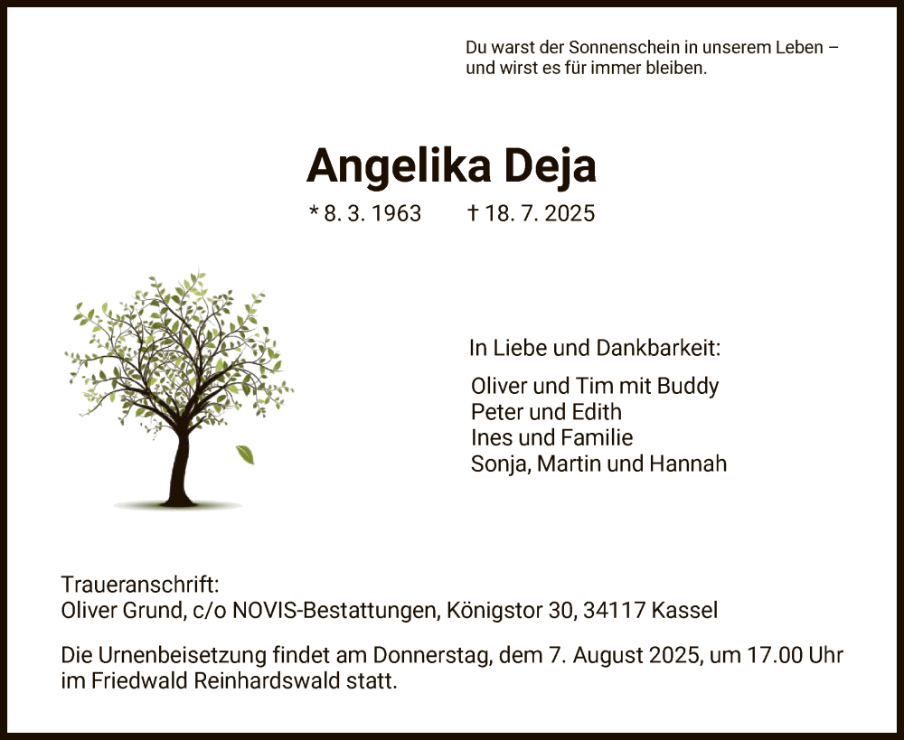 Hier finden Sie alle Traueranzeigen aus der Zeitung, die bisher für Angelika Deja erschienen sind. Weitere Traueranzeigen, die in der Zeitung erscheinen, werden hier ebenfalls aufgelistet