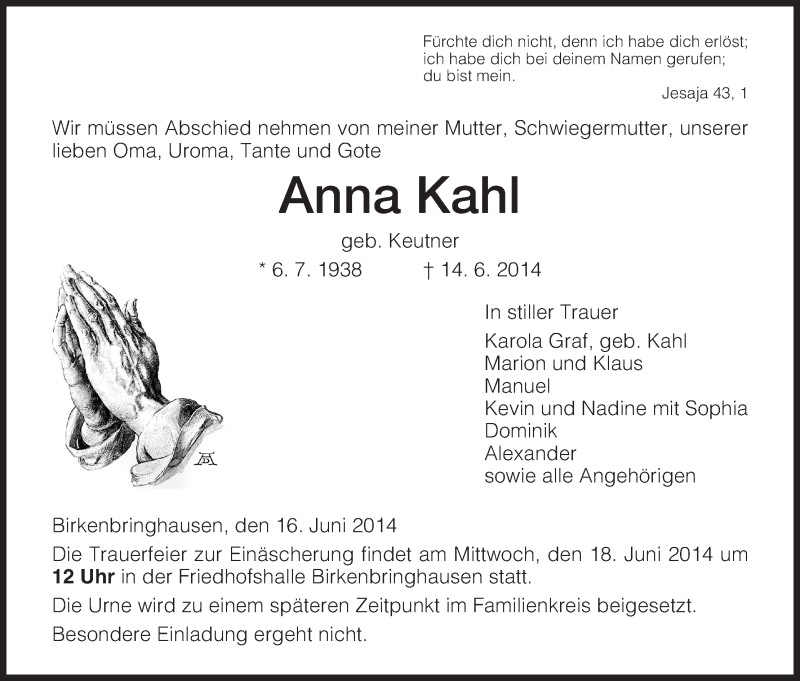 Hier finden Sie alle Traueranzeigen aus der Zeitung, die bisher für Anna Kahl erschienen sind. Weitere Traueranzeigen, die in der Zeitung erscheinen, werden hier ebenfalls aufgelistet
