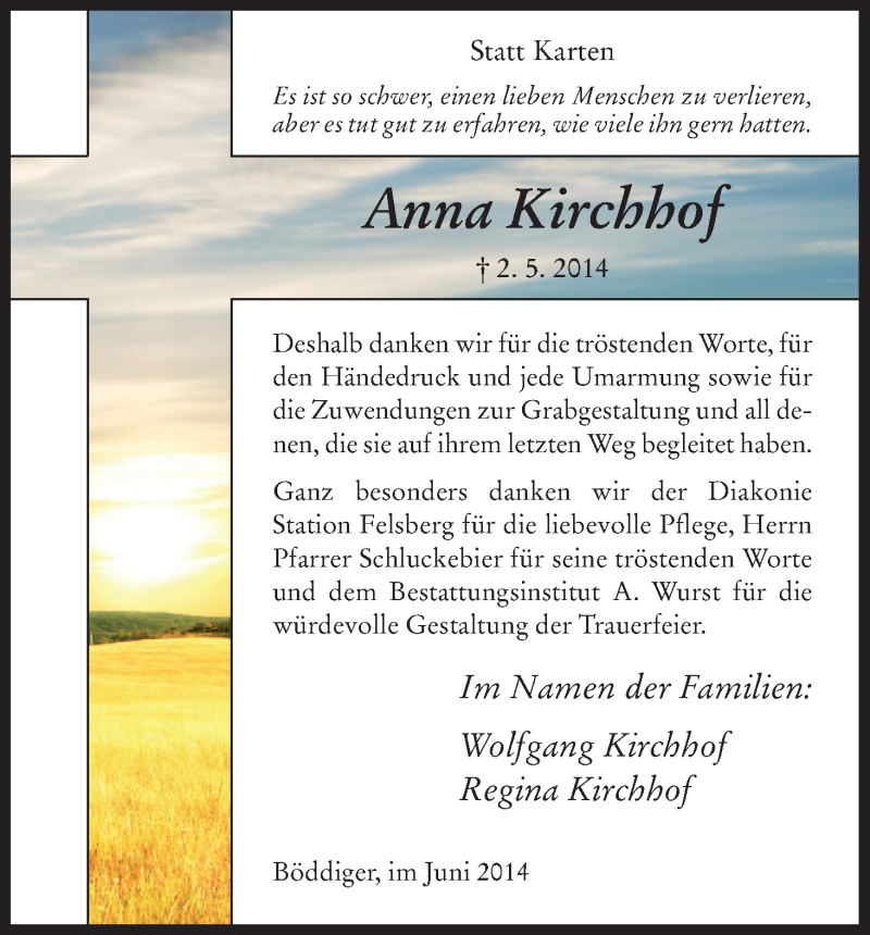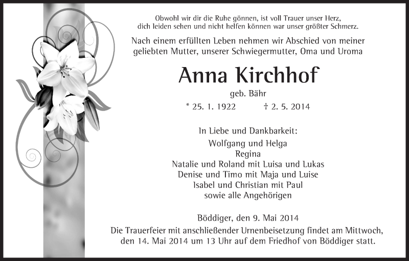 Hier finden Sie alle Traueranzeigen aus der Zeitung, die bisher für Anna Kirchhof erschienen sind. Weitere Traueranzeigen, die in der Zeitung erscheinen, werden hier ebenfalls aufgelistet