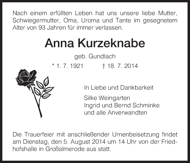 Hier finden Sie alle Traueranzeigen aus der Zeitung, die bisher für Anna Kurzeknabe erschienen sind. Weitere Traueranzeigen, die in der Zeitung erscheinen, werden hier ebenfalls aufgelistet