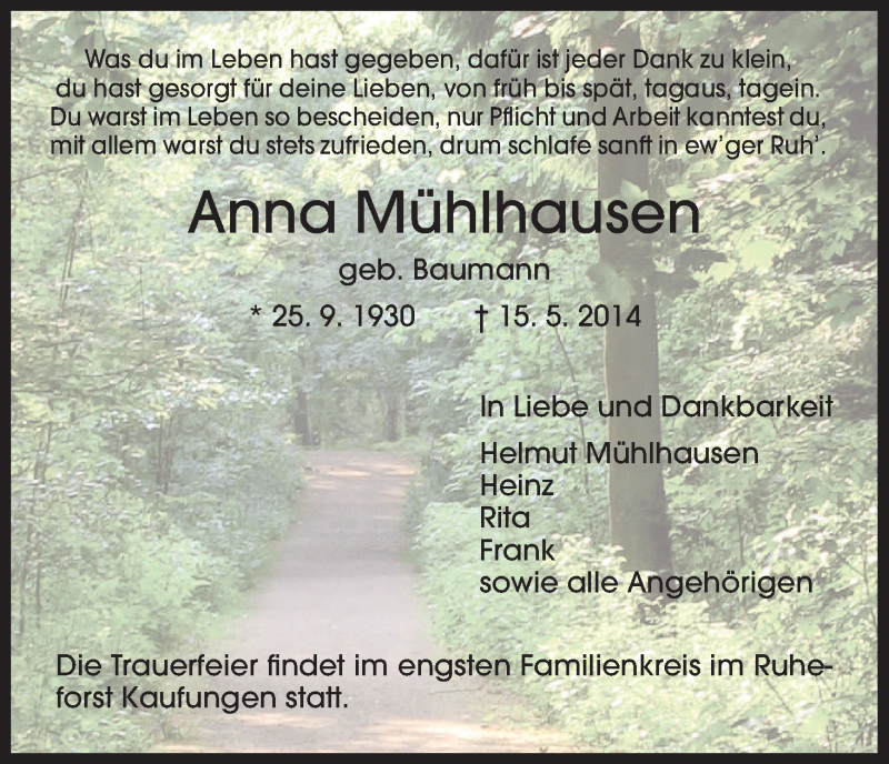 Hier finden Sie alle Traueranzeigen aus der Zeitung, die bisher für Anna Mühlhausen erschienen sind. Weitere Traueranzeigen, die in der Zeitung erscheinen, werden hier ebenfalls aufgelistet