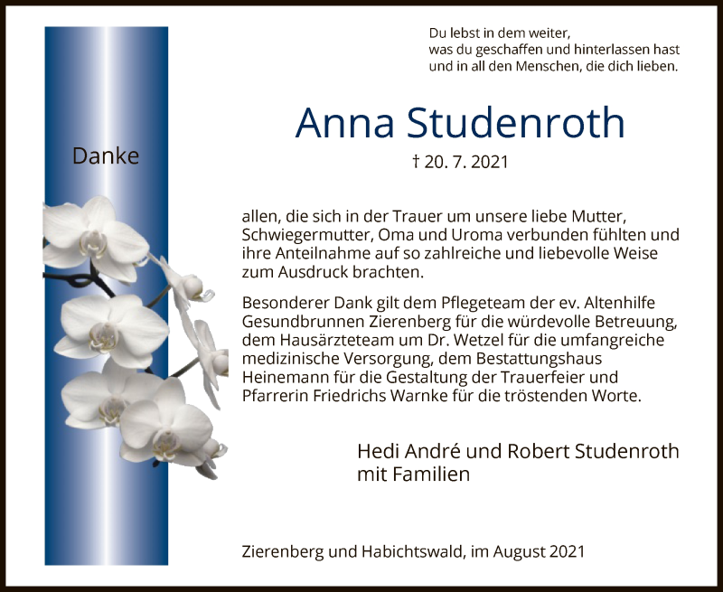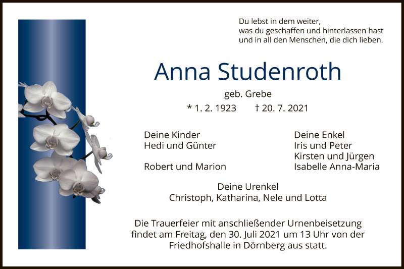 Hier finden Sie alle Traueranzeigen aus der Zeitung, die bisher für Anna Studenroth erschienen sind. Weitere Traueranzeigen, die in der Zeitung erscheinen, werden hier ebenfalls aufgelistet