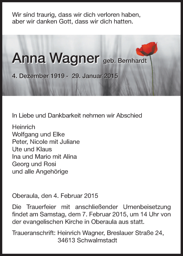 Hier finden Sie alle Traueranzeigen aus der Zeitung, die bisher für Anna Wagner erschienen sind. Weitere Traueranzeigen, die in der Zeitung erscheinen, werden hier ebenfalls aufgelistet