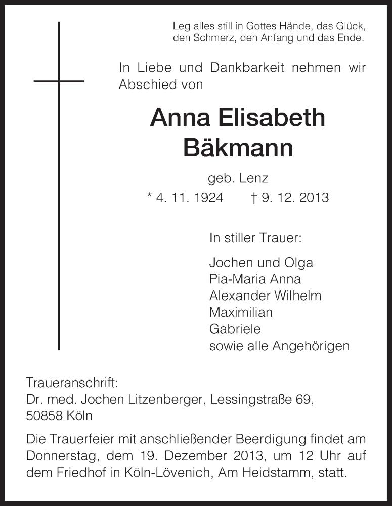 Hier finden Sie alle Traueranzeigen aus der Zeitung, die bisher für Anna Elisabeth Bäkmann erschienen sind. Weitere Traueranzeigen, die in der Zeitung erscheinen, werden hier ebenfalls aufgelistet