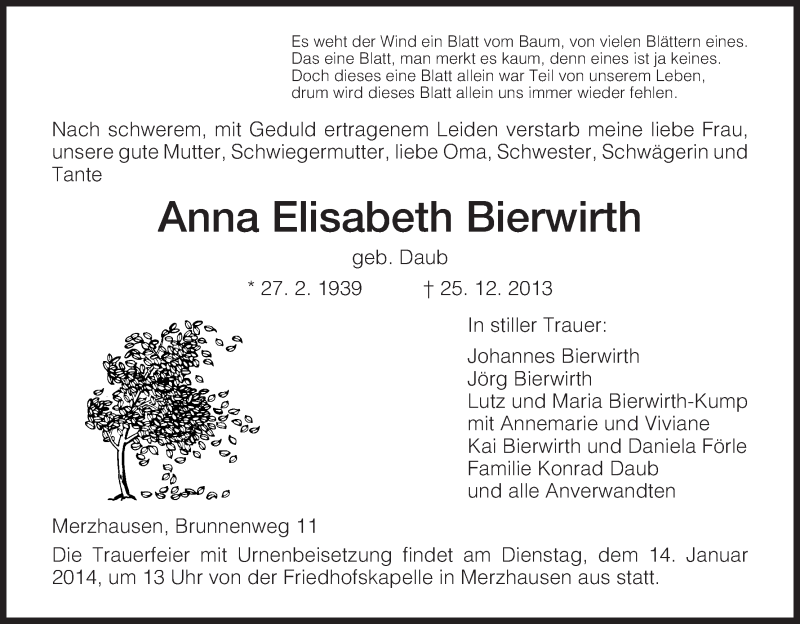 Hier finden Sie alle Traueranzeigen aus der Zeitung, die bisher für Anna Elisabeth Bierwirth erschienen sind. Weitere Traueranzeigen, die in der Zeitung erscheinen, werden hier ebenfalls aufgelistet