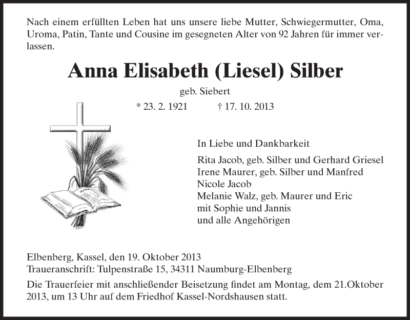 Hier finden Sie alle Traueranzeigen aus der Zeitung, die bisher für Anna Elisabeth Silber erschienen sind. Weitere Traueranzeigen, die in der Zeitung erscheinen, werden hier ebenfalls aufgelistet