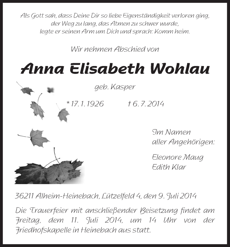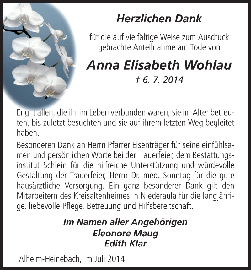Hier finden Sie alle Traueranzeigen aus der Zeitung, die bisher für Anna Elisabeth Wohlau erschienen sind. Weitere Traueranzeigen, die in der Zeitung erscheinen, werden hier ebenfalls aufgelistet