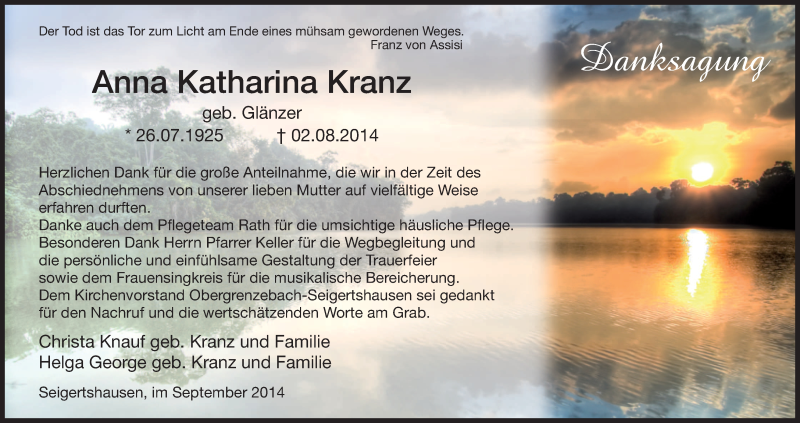 Hier finden Sie alle Traueranzeigen aus der Zeitung, die bisher für Anna Katharina Kranz erschienen sind. Weitere Traueranzeigen, die in der Zeitung erscheinen, werden hier ebenfalls aufgelistet