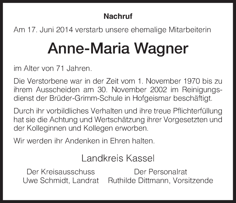 Hier finden Sie alle Traueranzeigen aus der Zeitung, die bisher für Anne-Maria Wagner erschienen sind. Weitere Traueranzeigen, die in der Zeitung erscheinen, werden hier ebenfalls aufgelistet