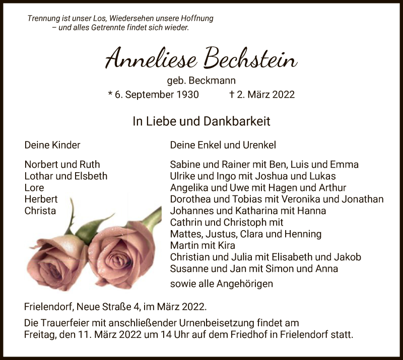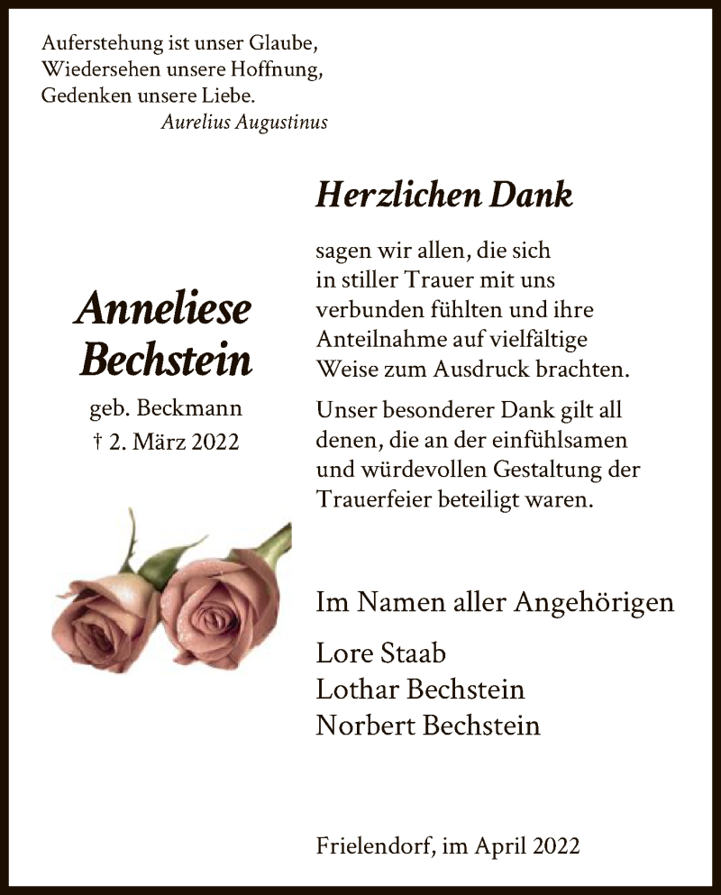 Hier finden Sie alle Traueranzeigen aus der Zeitung, die bisher für Anneliese Bechstein erschienen sind. Weitere Traueranzeigen, die in der Zeitung erscheinen, werden hier ebenfalls aufgelistet