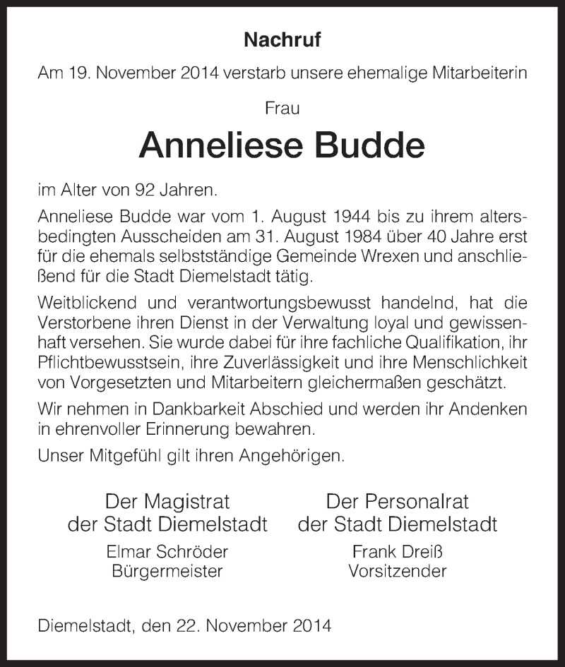 Hier finden Sie alle Traueranzeigen aus der Zeitung, die bisher für Anneliese Budde erschienen sind. Weitere Traueranzeigen, die in der Zeitung erscheinen, werden hier ebenfalls aufgelistet