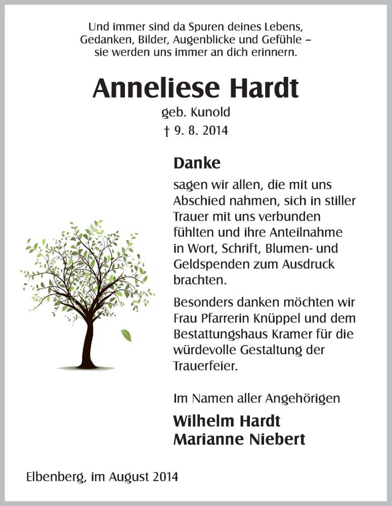 Hier finden Sie alle Traueranzeigen aus der Zeitung, die bisher für Anneliese Hardt erschienen sind. Weitere Traueranzeigen, die in der Zeitung erscheinen, werden hier ebenfalls aufgelistet