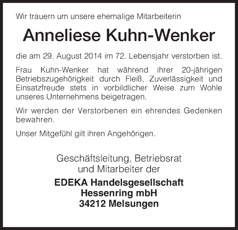 Hier finden Sie alle Traueranzeigen aus der Zeitung, die bisher für Anneliese Kuhn-Wenker erschienen sind. Weitere Traueranzeigen, die in der Zeitung erscheinen, werden hier ebenfalls aufgelistet