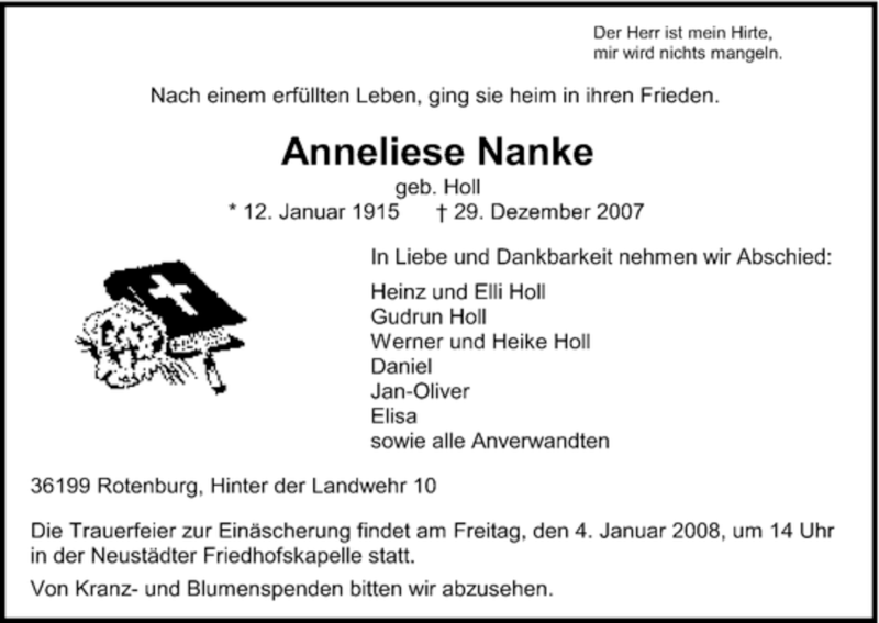 Hier finden Sie alle Traueranzeigen aus der Zeitung, die bisher für Anneliese Nanke erschienen sind. Weitere Traueranzeigen, die in der Zeitung erscheinen, werden hier ebenfalls aufgelistet