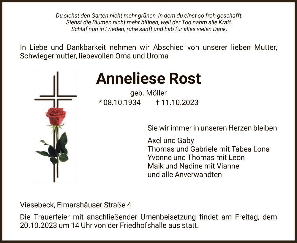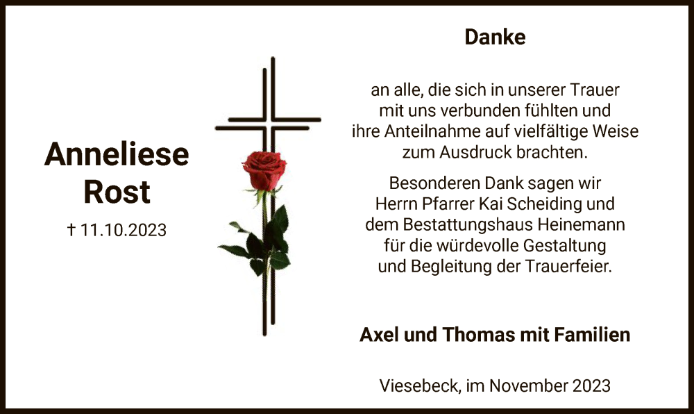 Hier finden Sie alle Traueranzeigen aus der Zeitung, die bisher für Anneliese Rost erschienen sind. Weitere Traueranzeigen, die in der Zeitung erscheinen, werden hier ebenfalls aufgelistet