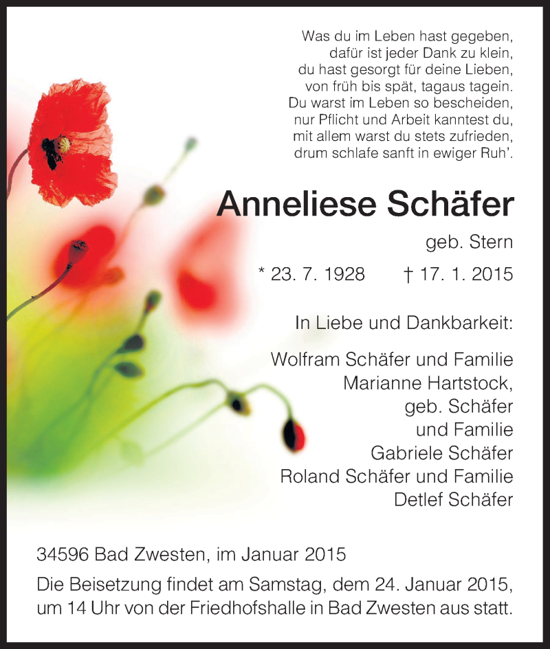 Hier finden Sie alle Traueranzeigen aus der Zeitung, die bisher für Anneliese Schäfer erschienen sind. Weitere Traueranzeigen, die in der Zeitung erscheinen, werden hier ebenfalls aufgelistet