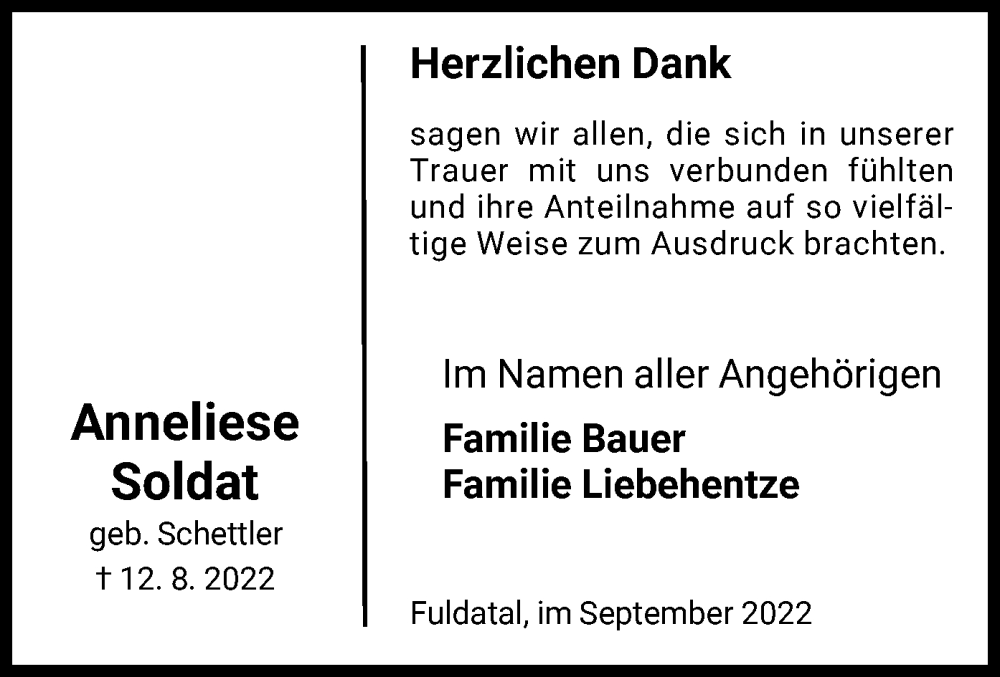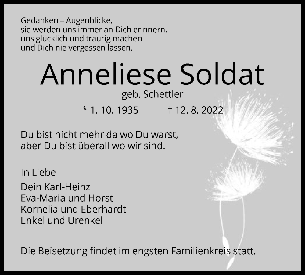 Hier finden Sie alle Traueranzeigen aus der Zeitung, die bisher für Anneliese Soldat erschienen sind. Weitere Traueranzeigen, die in der Zeitung erscheinen, werden hier ebenfalls aufgelistet