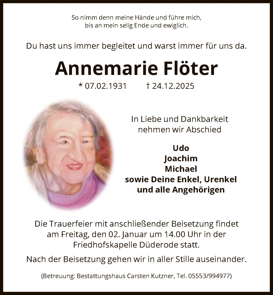 Hier finden Sie alle Traueranzeigen aus der Zeitung, die bisher für Annemarie Flöter erschienen sind. Weitere Traueranzeigen, die in der Zeitung erscheinen, werden hier ebenfalls aufgelistet