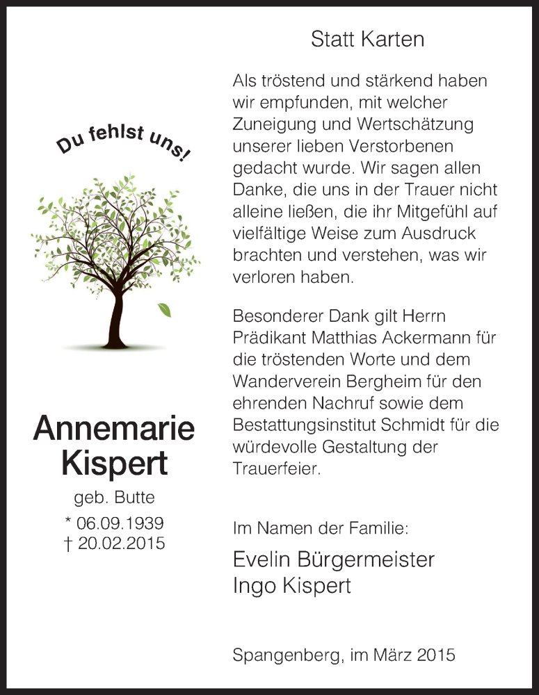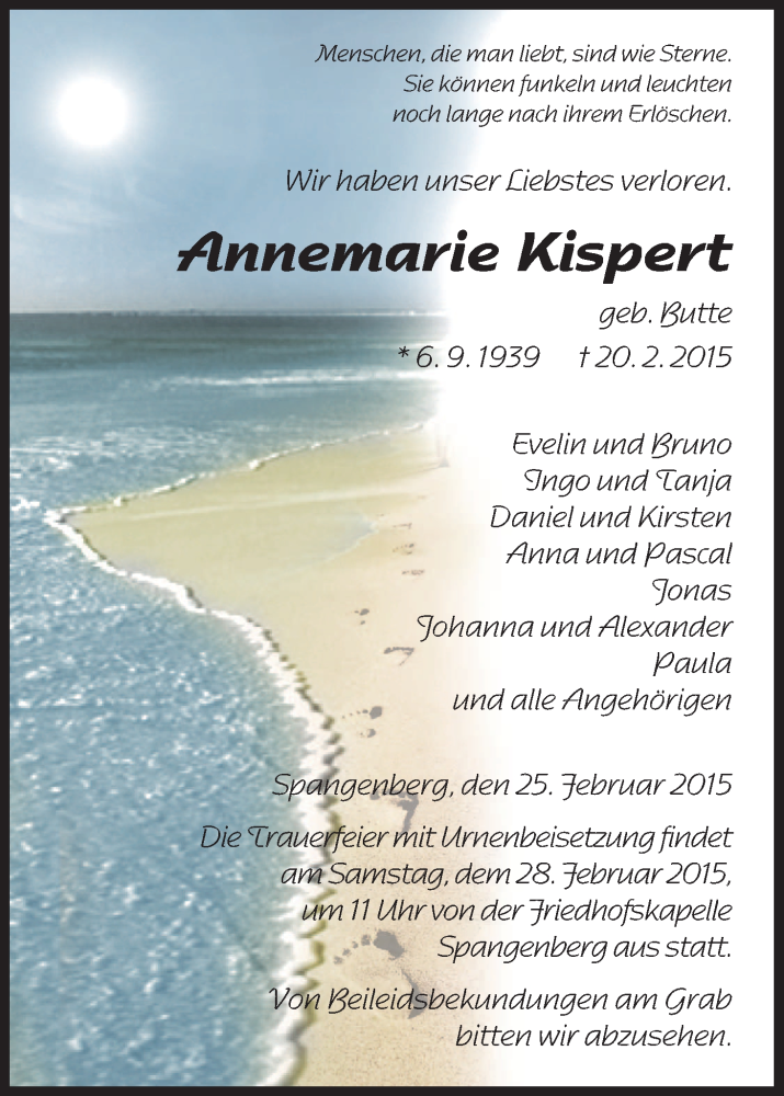 Hier finden Sie alle Traueranzeigen aus der Zeitung, die bisher für Annemarie Kispert erschienen sind. Weitere Traueranzeigen, die in der Zeitung erscheinen, werden hier ebenfalls aufgelistet