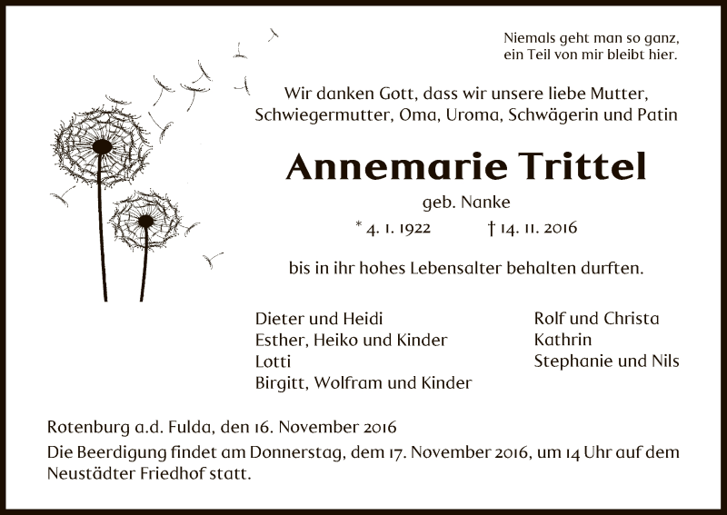 Hier finden Sie alle Traueranzeigen aus der Zeitung, die bisher für Annemarie Trittel erschienen sind. Weitere Traueranzeigen, die in der Zeitung erscheinen, werden hier ebenfalls aufgelistet