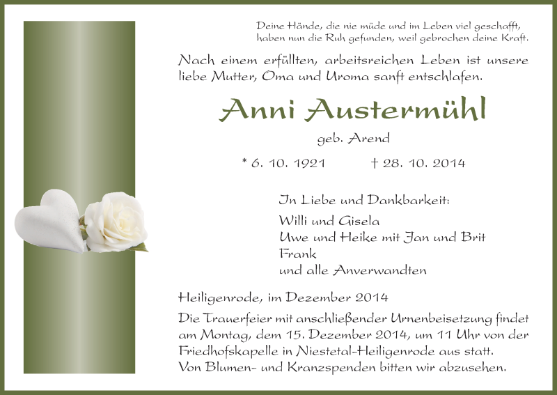 Hier finden Sie alle Traueranzeigen aus der Zeitung, die bisher für Anni Austermühl erschienen sind. Weitere Traueranzeigen, die in der Zeitung erscheinen, werden hier ebenfalls aufgelistet
