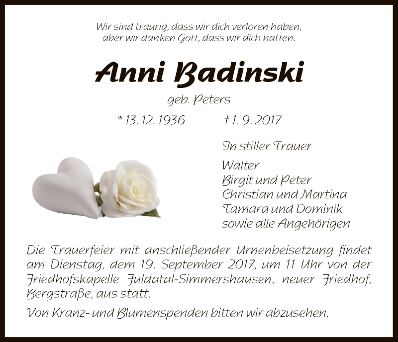 Hier finden Sie alle Traueranzeigen aus der Zeitung, die bisher für Anni Badinski erschienen sind. Weitere Traueranzeigen, die in der Zeitung erscheinen, werden hier ebenfalls aufgelistet