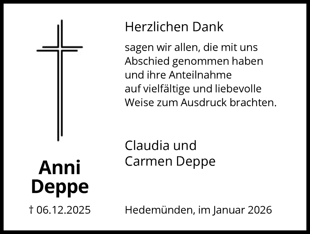 Hier finden Sie alle Traueranzeigen aus der Zeitung, die bisher für Anni Deppe erschienen sind. Weitere Traueranzeigen, die in der Zeitung erscheinen, werden hier ebenfalls aufgelistet