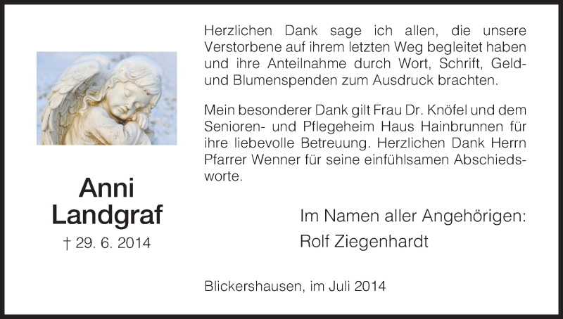 Hier finden Sie alle Traueranzeigen aus der Zeitung, die bisher für Anni Landgraf erschienen sind. Weitere Traueranzeigen, die in der Zeitung erscheinen, werden hier ebenfalls aufgelistet