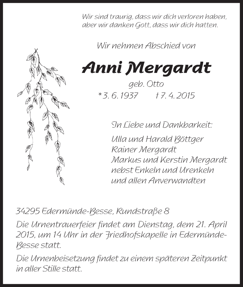 Hier finden Sie alle Traueranzeigen aus der Zeitung, die bisher für Anni Mergardt erschienen sind. Weitere Traueranzeigen, die in der Zeitung erscheinen, werden hier ebenfalls aufgelistet