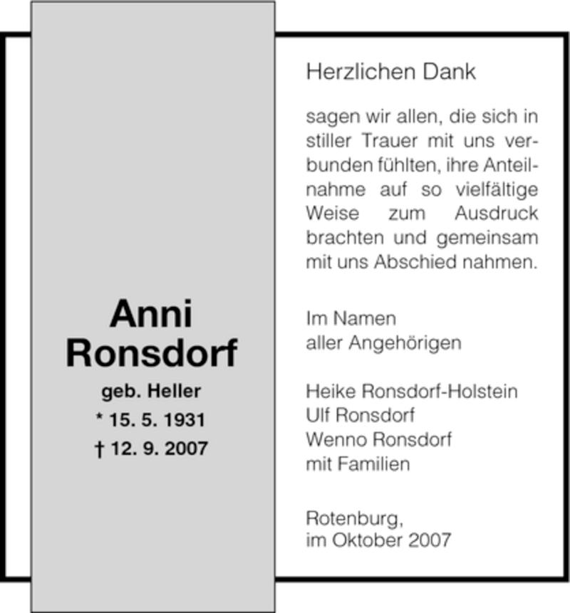 Hier finden Sie alle Traueranzeigen aus der Zeitung, die bisher für Anni Ronsdorf erschienen sind. Weitere Traueranzeigen, die in der Zeitung erscheinen, werden hier ebenfalls aufgelistet