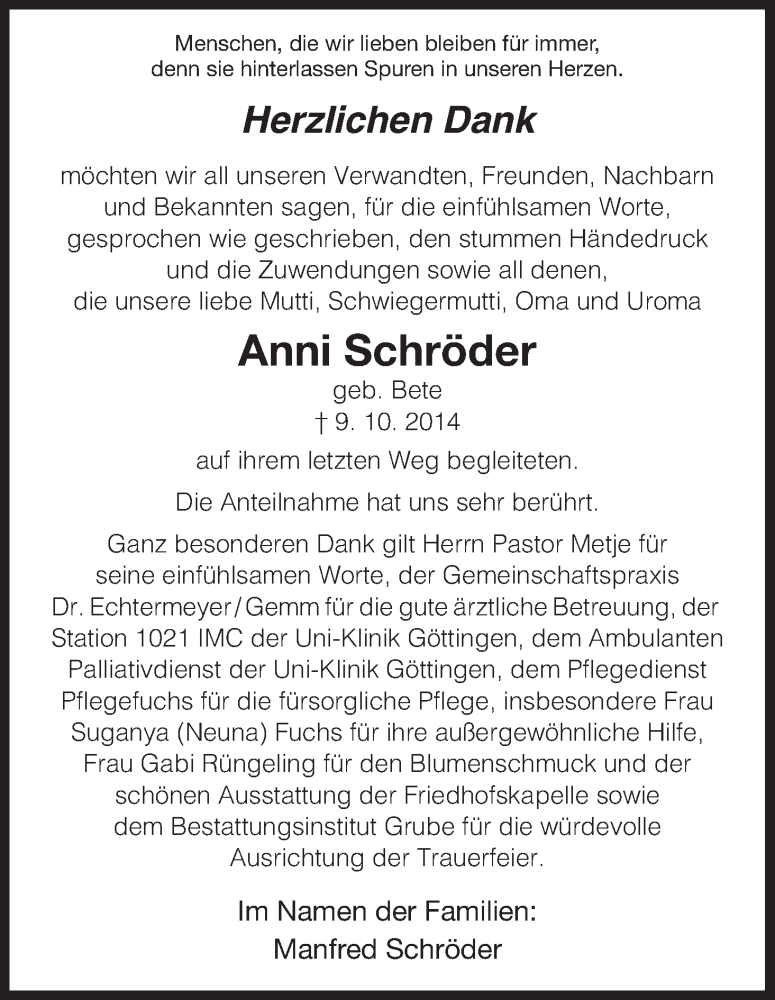 Hier finden Sie alle Traueranzeigen aus der Zeitung, die bisher für Anni Schröder erschienen sind. Weitere Traueranzeigen, die in der Zeitung erscheinen, werden hier ebenfalls aufgelistet