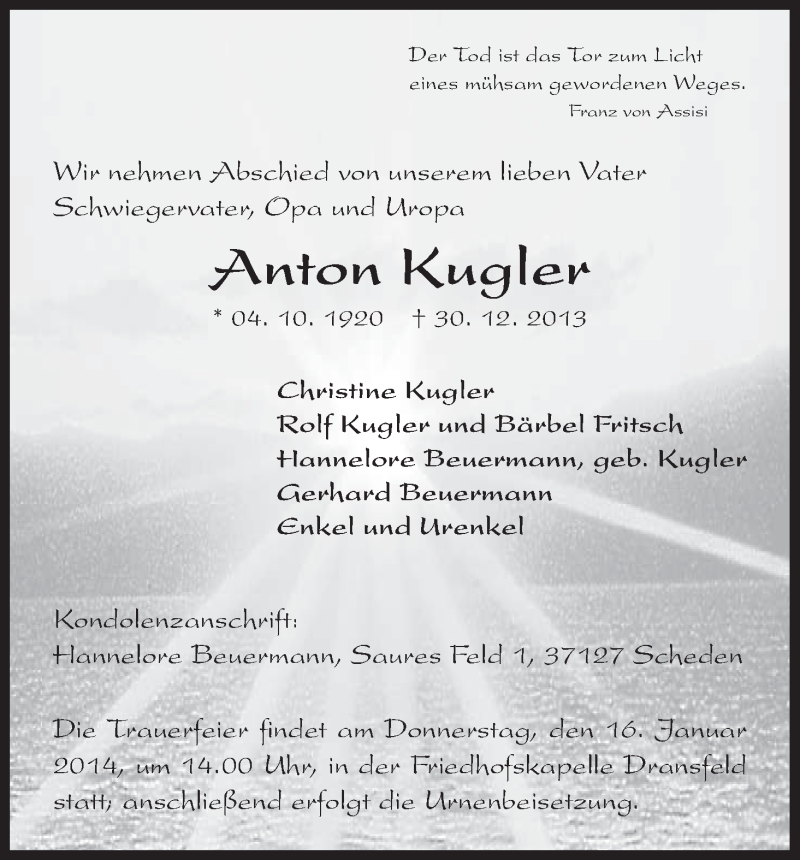 Hier finden Sie alle Traueranzeigen aus der Zeitung, die bisher für Anton Kugler erschienen sind. Weitere Traueranzeigen, die in der Zeitung erscheinen, werden hier ebenfalls aufgelistet