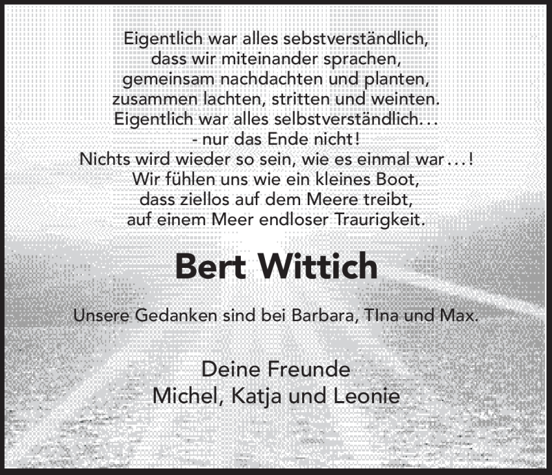 Hier finden Sie alle Traueranzeigen aus der Zeitung, die bisher für Bert Wittich erschienen sind. Weitere Traueranzeigen, die in der Zeitung erscheinen, werden hier ebenfalls aufgelistet