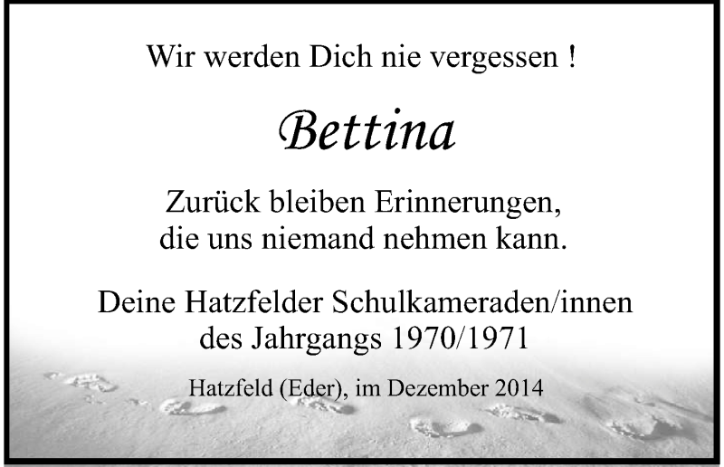 Hier finden Sie alle Traueranzeigen aus der Zeitung, die bisher für Bettina erschienen sind. Weitere Traueranzeigen, die in der Zeitung erscheinen, werden hier ebenfalls aufgelistet