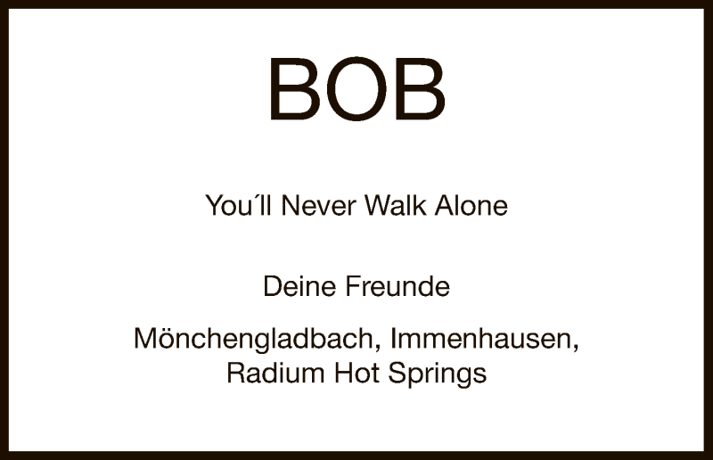 Hier finden Sie alle Traueranzeigen aus der Zeitung, die bisher für Bob erschienen sind. Weitere Traueranzeigen, die in der Zeitung erscheinen, werden hier ebenfalls aufgelistet