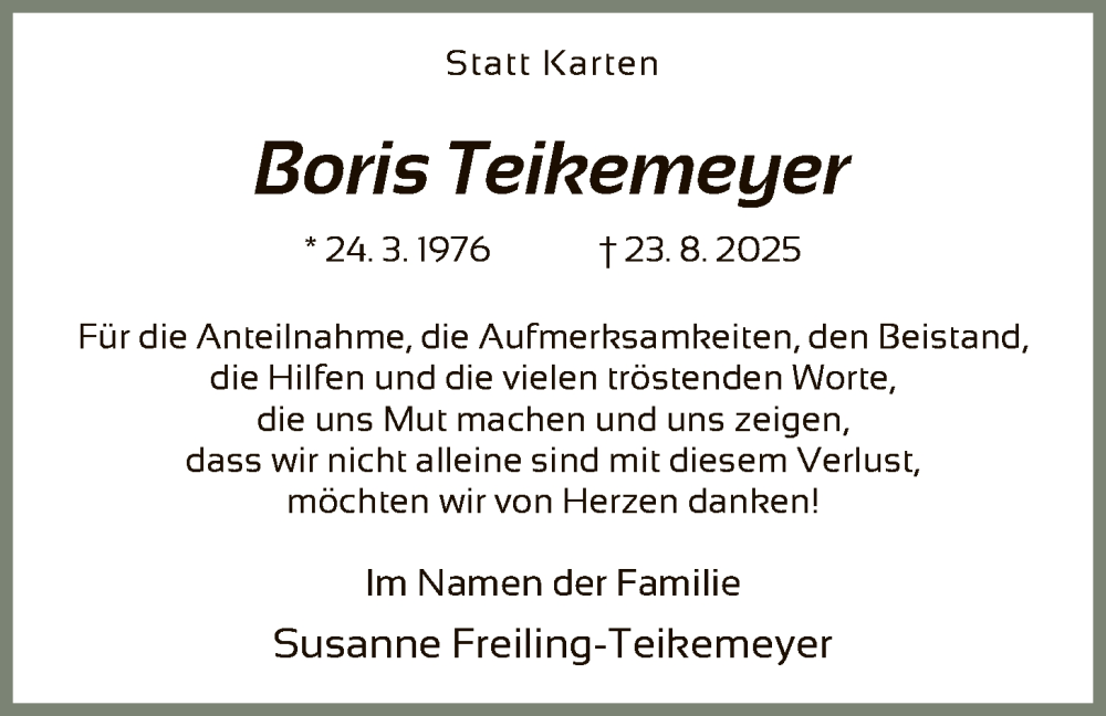 Hier finden Sie alle Traueranzeigen aus der Zeitung, die bisher für Boris Teikemeyer erschienen sind. Weitere Traueranzeigen, die in der Zeitung erscheinen, werden hier ebenfalls aufgelistet