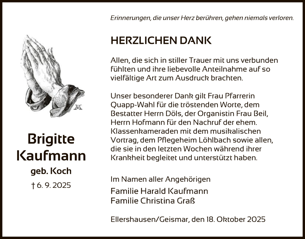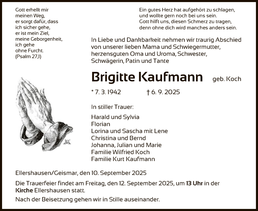 Hier finden Sie alle Traueranzeigen aus der Zeitung, die bisher für Brigitte Kaufmann erschienen sind. Weitere Traueranzeigen, die in der Zeitung erscheinen, werden hier ebenfalls aufgelistet