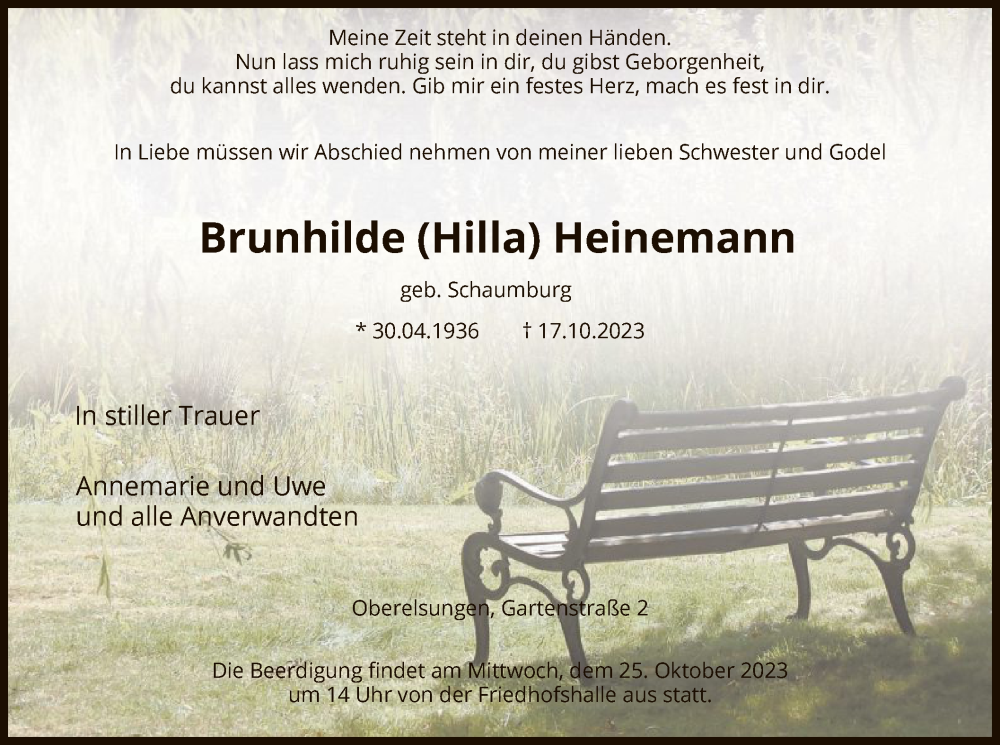 Hier finden Sie alle Traueranzeigen aus der Zeitung, die bisher für Brunhilde Heinemann erschienen sind. Weitere Traueranzeigen, die in der Zeitung erscheinen, werden hier ebenfalls aufgelistet