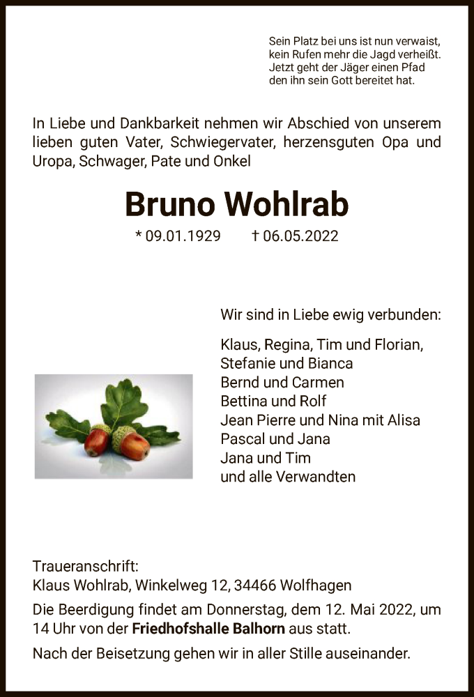 Hier finden Sie alle Traueranzeigen aus der Zeitung, die bisher für Bruno Wohlrab erschienen sind. Weitere Traueranzeigen, die in der Zeitung erscheinen, werden hier ebenfalls aufgelistet