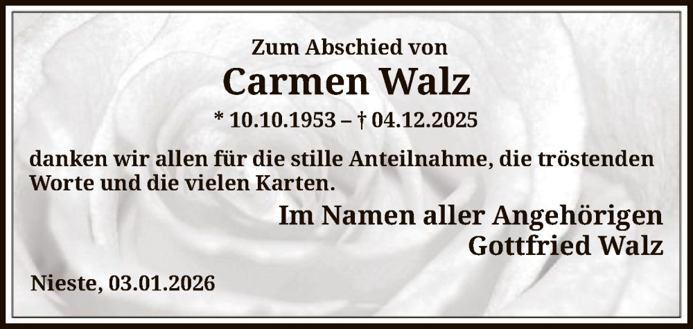 Hier finden Sie alle Traueranzeigen aus der Zeitung, die bisher für Carmen Walz erschienen sind. Weitere Traueranzeigen, die in der Zeitung erscheinen, werden hier ebenfalls aufgelistet